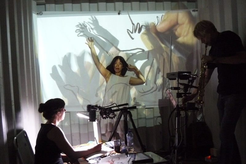 Lies van Gasse en Jan Klug ontmoetten elkaar op podium, bij een gezamenlijk optreden op Vlieland in 2014. Een toekomstige samenwerking was snel besloten zaak. Zij hebben gemeen dat zij in en tussen meerdere disciplines werken: Lies is tegelijk dichteres en tekenares, wat in haar graphic poetry zoals in het boek ‘Zand op een Zeebed’ goed te zien valt. Jan Klug combineert ‘echte instrumenten’ zoals saxofoon en theremin met electronica, en produceert ook visuals voor dans of theater. In deze voorstelling zal hij de live geproduceerde tekeningen van Lies in een zelf-geprogrammeerd systeem vangen. Jan en Lies zullen elke avond een andere gast (schrijver, kunstenaar, acteur) ontvangen, waarmee zij samen korte, volledig geïmproviseerde voorstellingen weven van poëzie, surrealisme, soundscapes en licht.